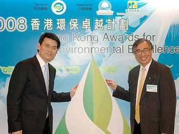 香港环境局局长邱腾华(左)与香港环境保护运动委员会主席李宗德主持“2008香港环保卓越计划”开幕典礼。(图片来源:香港特区政府网站)