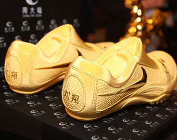 除黄金砖墙外,另一个焦点是刘翔黄金跑鞋,以纯金打造的“黄金跑鞋”,其原形来自刘翔在洛桑破纪录时所穿的跑鞋,长26厘米,以实物原大小一比一打造,黄金重约16两,约值港币238000元。制作需时,由于跑鞋的纹理十分多,以及非常复杂,单是制作蜡模已经需时40天,黄金跑鞋总共需时2个月才完成。