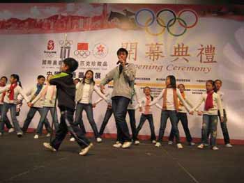 学生们专心为奥运百年珍品展开幕式彩排(大公报图)