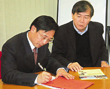 朱力径在会见湖北大冶一中校长黄开福(左)一行时透露,未来或将内地招生名额相对调低,并考虑向台湾及东南亚拓展生源。(图片来源:文汇报)