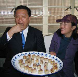图:在湾仔船街18号经营的“鸳鸯饭店”主打有香港本土特色的怀旧菜,市建局主席张震远品尝萝卜糕后激赞叫好,饭店老板徐蒝眉开眼笑。(图片来源:大公报)