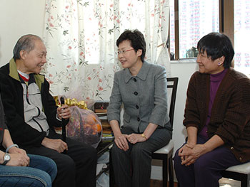 香港发展局局长林郑月娥探访居于葵涌的长者夫妇,听取他们维修物业所面对的困难。(图片来源:香港特区政府网站)
