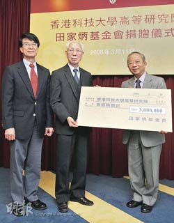 据香港媒体报道,田家炳基金会捐款300万元给科大高研院,加上政府的配对基金,成立600万元的“田家炳教育基金”。基金会主席田家炳、科大校董会主席陈祖泽及校长朱经武11日出席了捐赠鸣谢仪式。