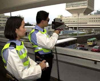 图:警务人员操作一部激光枪在中区侦察超速车辆。(图片来源:大公报)