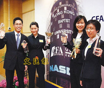 中新网5月13日电 据香港文汇报报道,投资炒股是香港市民生活的一部分,近年更涌现出不少年轻“股神”。香港浸会大学工商管理学院4位本科生通过7个月的多轮比赛,打败全球79队参加者,是香港学生首次夺得在纽约举行的“全球投资分析比赛”总冠军。