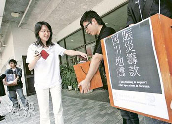 中新网5月15日电 据香港明报报道,四川灾情严峻,港人纷纷捐款赈灾,短短两日,中联办已收到香港各界逾1.3亿元捐款。不同界别各出其谋筹款,香港教育界呼吁全港所有中小学生捐10元、教师捐100元赈灾。