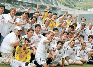 香港不少团体18日为四川地震灾民筹款,明星足球队(图)在大球场举行慈善赛,与由警队“一哥”邓竟成助阵的足总邀请队友赛。(图片来源:明报)