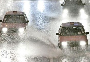 近日天气不稳,3日傍晚香港普遍地区下大雨,天文台发出一个多小时黄色暴雨警告,湾仔告士打道一带变成泽国,但暴雨来得快、去得快,渠务署没有接到水浸报告。(图片来源:明报)