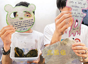香港海洋公园学院学员展示用“盈盈”和“乐乐”的粪便制造的环保纸。(图片来源:文汇报)