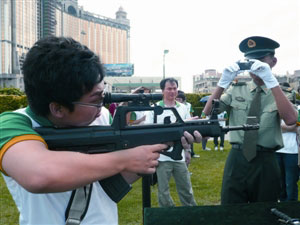 图:学生手持自动步枪照相。(图片来源:澳门日报)