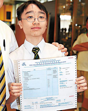 香港考评局把香港的会考中、英文科与IGCSE的评级挂钩,因此其IGCSE英文科成绩即相当于香港会考的5*,中文科相等于第4级。而他最新应考的托福试成绩也达114分(满分为120分)。
