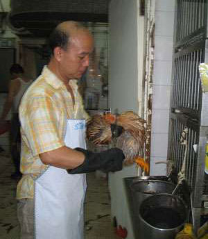 黄伟泉纯熟地宰杀鸡档的最后一只鸡。(图片来源:大公报)
