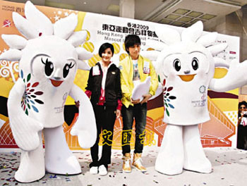东亚运动会吉祥物“东仔”和“亚妹”。(图片来源:文汇报)