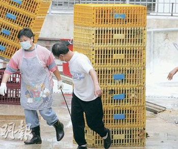 香港自元朗鸡场爆发禽流感后禁售活鸡21天,30日解禁,长沙湾批发市场工人29日赶忙将抵港内地活鸡送往安置。(图片来源:明报)