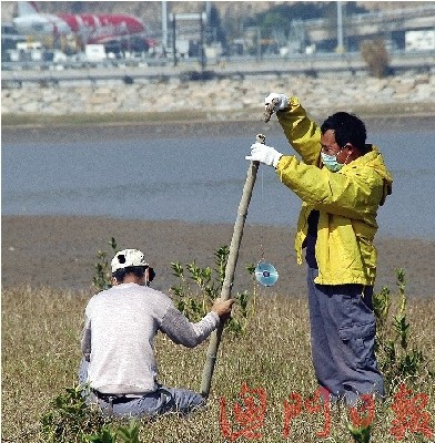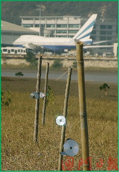 民署为免雀鸟在堆填区和浅滩觅食,到处乱飞而影响航班升降,18日上午派出工程人员在堆填区架设由回收光盘组成的反光装置。该反光装置由四片组成一个三角锥体,再以一条鱼丝悬空吊在竹枝上,反光装置可随风飘扬,将阳光向四周折射,干扰雀鸟活动,从而惊吓雀鸟。