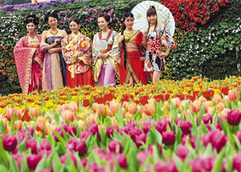 今年花展设有多个别致景点,包括以超过1.5万株郁金香铺设而成的逾190平方米的圆形花海,主办方还首次设立T形观景花台,本星期六、日还有两场以体育服装及婚纱为主题的时装表演。