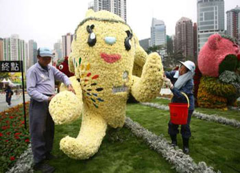 香港康文署主办的2009香港花卉展览由13日至本月22日在维园举行。为配合迎接东亚运动会的主题,现场放置用4万株花卉嵌植成的大型展品“万花喜迎东亚运”,配合烟花、奥运五环等花卉组图,烘托出喜迎东亚运动会的气息。
