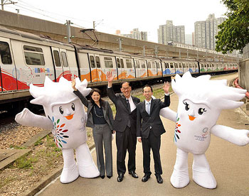该三列色彩缤纷的港铁列车,以东亚运吉祥物“东仔”和“亚妹”所展示的比赛项目作装饰,19日起在港岛线、九龙线及荃湾线行走。
