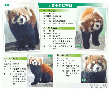 成都大熊猫繁育研究基地向海洋公园借出的4只小熊猫,名字分别叫泰山、聪聪、柔柔和栗子,两雄两雌,现时仍未满1岁,平均只有8至9个月大,属基地繁殖的第二代小熊猫,各有不同性格及特征。