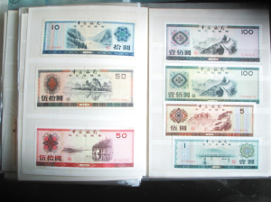 到了80年代,国家开始发行“外汇券”,当时中国银行于1980年4月1日发行了一种在中华人民共和国境内流通可与外币兑换的特殊人民币凭证,共7种面额:分别为一百元、五十元、十元、五元、一元、五角、一角;9个版别,外汇券正面为中国的风景名胜和中文“中国银行外汇兑换券”的字样及金额;背面则为英文“BANK OF CHINA FOREIGN EXCHANGE CERTIFICATE”和中英文字“本券的元与人民币等值。本券只限在中国境内指定范围使用,不得挂失”的字样及金额。