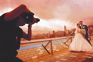 傍晚,在维多利亚港一对新人留下难忘的一瞬。(图片来源:广州日报)