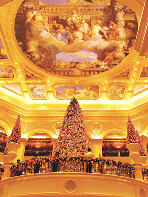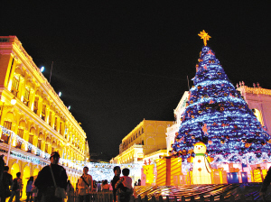 澳门的议事厅前地那一棵足有两三层楼高的许愿树灯饰会让你眼前一亮,一层层蓝盈盈小灯密密围着,丝毫不会露出光裸电线,底下是制作颇为精细的大雪人,礼物堆,可爱得几乎每个经过的路人都忍不住要掏出手机去拍一张,小孩子更不用说了,嚷嚷要妈妈放开手好让他爬上去拆礼物,看得人忍不住要会心微笑。然后邮政局门口那一棵许愿树也十分华丽,而且是很别出心裁地“长”在了大门口,叫进出的人都觉得自己是在天使庇佑之下似的,忍不住要在心里许个小小愿望。即使是在普通的非闹市区,马路上也挂上了串串灯饰,显得气氛特别浓。至于各大娱乐场所里面的许愿树,更是一棵赛一棵的漂亮,一层楼高的是小意思,两层楼高的是普通规模,最夸张的是威尼斯人度假村,几乎每隔一段距离就有一棵或大或小的许愿树,上面还很细心地挂满了蝴蝶结、许愿球、小礼物、小袜子……看得人又忍不住要掏手机来玩自拍,不过即使一棵一张,估计即使是512M的卡都会不够用呢。