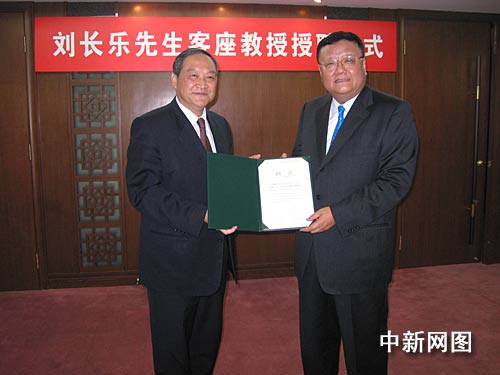 中新网12月6日电 广州中山大学校长黄达人今天向凤凰卫视董事局主席兼行政总裁刘长乐颁发客座教授聘书。