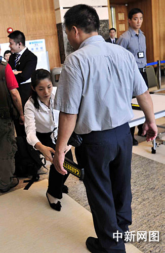 澳门特首选举媒体入场要安检。澳门特区举行第三任行政长官选举。澳门特别行政区第三任行政长官选举,二十六日在澳门举行。图为媒体入场要安检。 记者 谭达明 摄