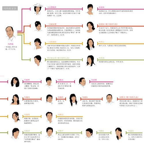 作为澳门首富,“赌王”何鸿燊及其家族控制着高达5000亿港元的资产;同时,作为富人明星,何鸿燊不但被港澳坊间称为“何大口”(对媒体说话百无禁忌),其四位太太所生的17个子女,更一直是各大报纸杂志商业、时政和娱乐版多年来的风头人物。