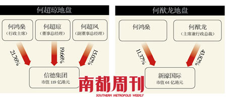 何鸿燊旗下的商业王国中,以信德集团最为实业化,经营房地产、酒店及运输等业务,由二太太长女何超琼任董事总经理,二太太三个女儿也占股权共37%,是名副其实的大股东;二太太长子何猷龙担任董事长的新濠国际,何鸿燊所占股份也低于儿子。