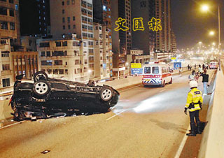 中新网3月2日电 2偷车贼1日凌晨偷车后在港岛掀起警匪飞车追逐。由于失车安装有卫星导航防盗系统,偷车贼在被警方发现后亡命飞车,后贼车发现有警察路障掉头再逆线疯狂行车,连环与的士及警车相撞后翻侧滑行50米停下,驾车疑匪头部受伤被捕,一名同党则沿行车天桥徒步逃脱,另有4警受伤。