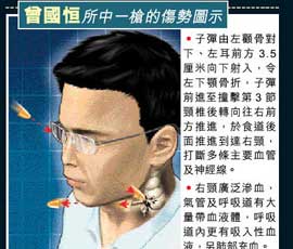 宪生署高级法医黄汉文昨供称,曾国恒只中一枪,右颈位置发现一枚弹头及子弹外壳。子弹由左面颧骨射入,穿过左下颚骨,再撞向颈骨改变方向,冲前至右颈位置,其中一块弹碎切断三条动、静脉大血管,弹头最后卡在喉咙位置。