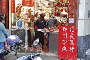 中新网4月6日电 据澳门日报报道,不少孝子贤孙预订祭祖用的烧猪,准备清明祭祖,澳门部分烧腊店五日午后仍然挤满排队买烧味的人群。