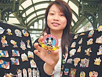 香港迪斯尼自去年十二月在园内小镇大街设置徽章交换处后,成功吸引一批徽章迷,在颈上挂着连串的徽章。迪斯尼乐园采购经理胡碧思表示,现时每月员工与游客交换五千至八千个徽章,反应热烈,决定在本月十三日至十五日,举行首次“徽章交换同乐日”,有超过一百款、逾五千个越洋徽章供交换,包括○四年雅典奥运主题、美国五十周年等徽章。