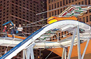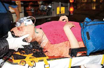 中新网4月18日电 添马舰AIA香港环球嘉年华昨(17日)晚被怪风吹袭,现场一个约30呎长,重达500公斤的巨型灯饰招牌,怀疑被风速高达80公里的狂风吹塌,跌于一个名为激流滚木机动游戏的路轨上,并压中两个载有乘客的水上过山车,其中一辆过山车上有一男两女见习医生被击中受伤,一度被困于离地约40呎高的路轨上,须由消防员救出送院,其中一名女子伤势较严重。