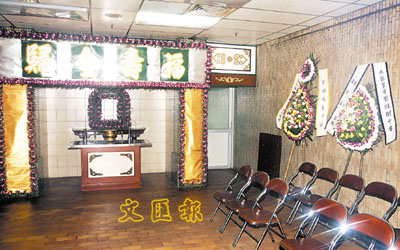 据悉,灵堂截至晚上7时许,没有人出现过,内里布置也空荡荡,幸有传媒机构、摄影师朱迅和吴文正联署送赠的两个花牌“充撑”场面。