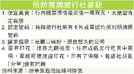 利伟强指出,旅客在持牌旅行社光顾机票、住宿或观光行程任何两项,即可获印花盖印,出事时可获旅游业议会 赔偿 。唯有不法分子故意替客人“分单”,让旅客丧失保障 ,市民需多加留意,光顾信誉好的旅行社。