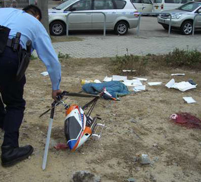 罗国华躲避不及,后脑当场被高速旋转的螺旋桨击中,劈开又深又长的伤口,血流如注昏倒地上,直升机也随即坠地翻滚,其中一截螺旋桨也被折断,朋友见状急忙报警。
