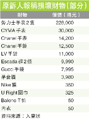 唐仔细罗列37项受损财物,其中以衣物为主,包括价值50元的内衣及成衣品牌Baleno出品的T恤;另外的名贵财物包括接近4000元的茅台酒、劳力士、Chanel及CYMA等4只名表,所有财品总值36.6万元。此外,唐的一块载有婚宴来宾签字的红布,以及数项衣物亦损坏,但价值有待确定。
