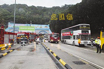 中新网2月3日电 据香港文汇报报道,香港大老山隧道2日发生火烧巴士惊险意外。一辆载有乘客的双层九巴疑车尾引擎过热冒烟起火,司机立刻停车及疏散车厢内25名乘客,各人沿隧道管道自行步行出隧道口逃生,其中5名男女乘客分别因吸入浓烟及擦伤手脚送院。