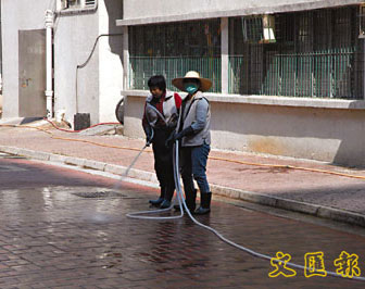清洁工人正在清洗幼儿园的地面。(图片来源:文汇报)
