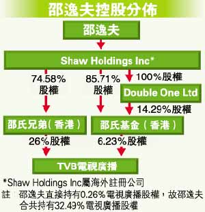 目前邵逸夫透过邵氏兄弟(上市公司)、邵氏基金及个人直接持有,合共持有电视广播32.49%股权。若有买家对电视广播有兴趣,可向邵氏直接购入电视广播股权,或收购市值较低的邵氏兄弟,达至以较低成本间接控制电视广播。
