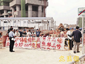 中新网4月11日电 据香港文汇报报道,香港将军澳日出康城建筑地盘再度发生工潮,近50名泥水工人不满被二判拖欠2个月工资,涉款170多万元,10日在地盘外拉横额抗议,并企图抢夺铁马冲击警方封锁线,堵塞环保大道,及时被警方制止。