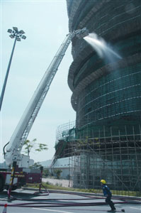 图:消防员升起云梯射水灌救。(图片来源:澳门日报)