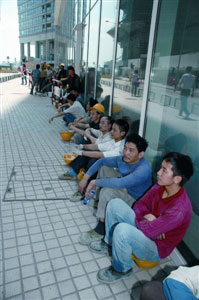 图:工人在街上等候地盘解封。(图片来源:澳门日报)