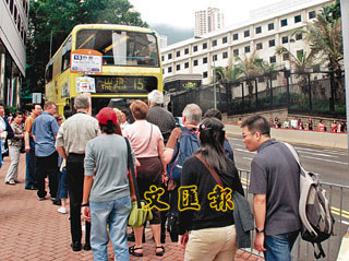 香港山顶缆车服务暂停,大批游客须改乘巴士上山顶。(图片来源:文汇报)