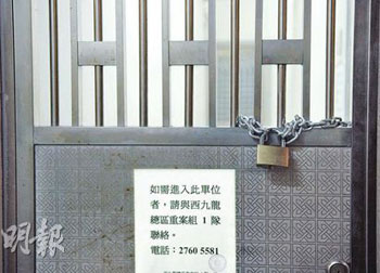 相信是案发第一现场的石硖尾街套房大门由粗铁链锁上,进入单位者须与重案组探员联络。(图片来源:明报)