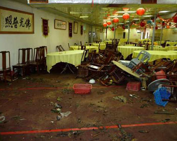 图:大雨造成的洪水将斋菜餐厅的桌椅悉数冲毁。(图片来源:大公报)