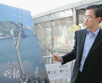 图:昂坪360董事总经理张少华以照片解释缆车事故,指由于一架救援吊车的油压出现问题,故公司决定继续停止缆车服务。(图片来源:明报)