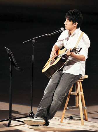 图:房祖名自弹自唱送给四川灾区人民。(图片来源:文汇报)